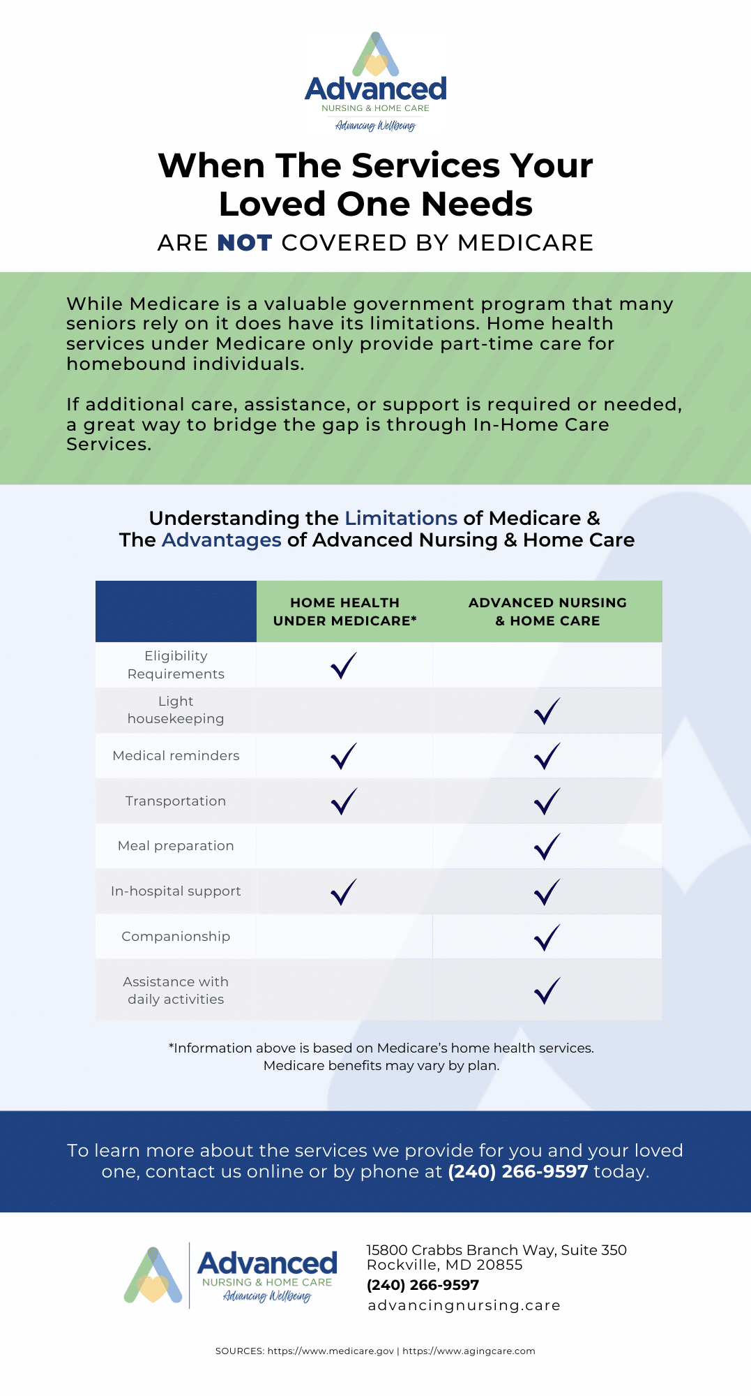We are breaking down some of the limitations of Medicare and Home Health services in this infographic. Our team at Advanced Nursing & Home Care can offer personalized and comprehensive care to enhance the wellbeing, comfort, and quality of life of seniors, individuals with physical disabilities, veterans, and more. For more information on this, check out our blog: Providing the Care and Support Your Loved One Needs and Deserves.